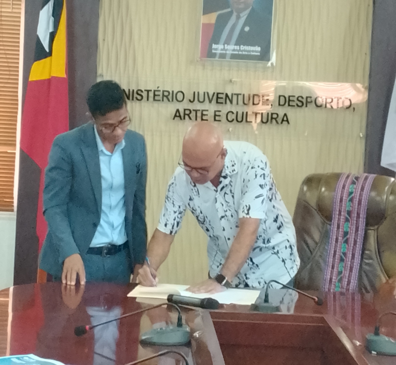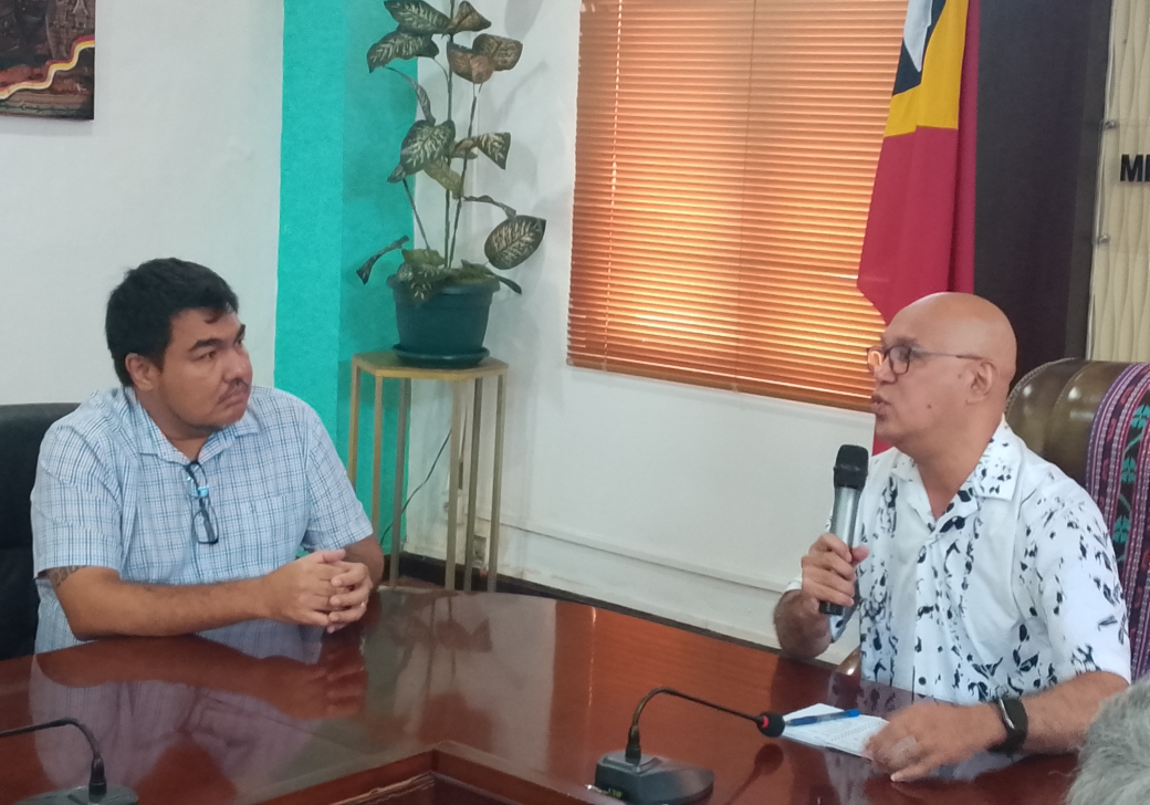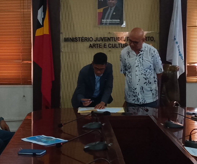 DILI, 23 Abríl 2026 (GCI/MJDAK) – Sua Exelénsia Ministru Juventude, Desportu, Arte no Kultura (MJDAK), Nelyo Isaac Sarmento, hala’o sorumutu ordináriu ho Prezidente Federasaun Futeból Timor-Leste (FFTL), Nilton Telmo Gusmão, no Prezidente Liga Futeból Timor-Leste (LFTL), Ipolito Soares, hodi diskute preparasaun ba re-ativasaun kompetisaun futeból nasionál. Sorumutu ne’e hala’o iha Salaun Magna MJDAK, kinta-feira ne’e.