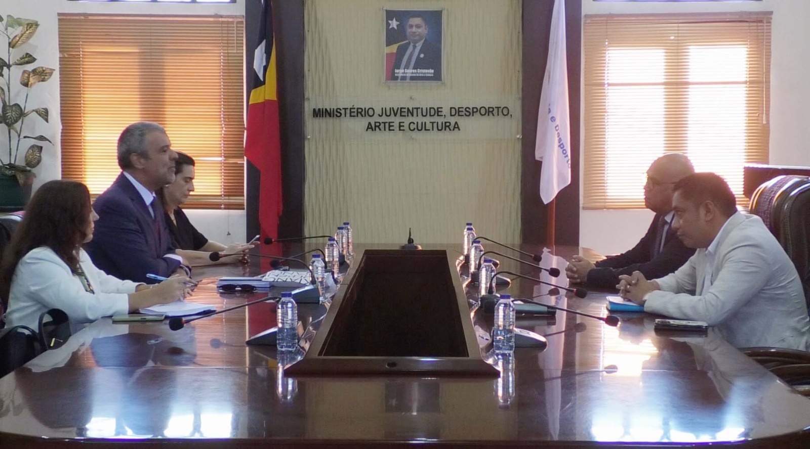 DILI, 16 Abríl 2026 – Sua Exelénsia Ministru Juventude, Desportu, Arte no Kultura (MJDAK), Nelyo Isaac Sarmento, ne’ebé akompaña husi Sekretáriu Estadu Arte no Kultura (SEAK), Jorge Soares Cristóvão, simu vizita kortejia husi Embaixadór Portugal iha Timor-Leste, Duarte Bué Alves, iha Salaun Magna MJDAK, Lecidere, kinta-feira ne’e.